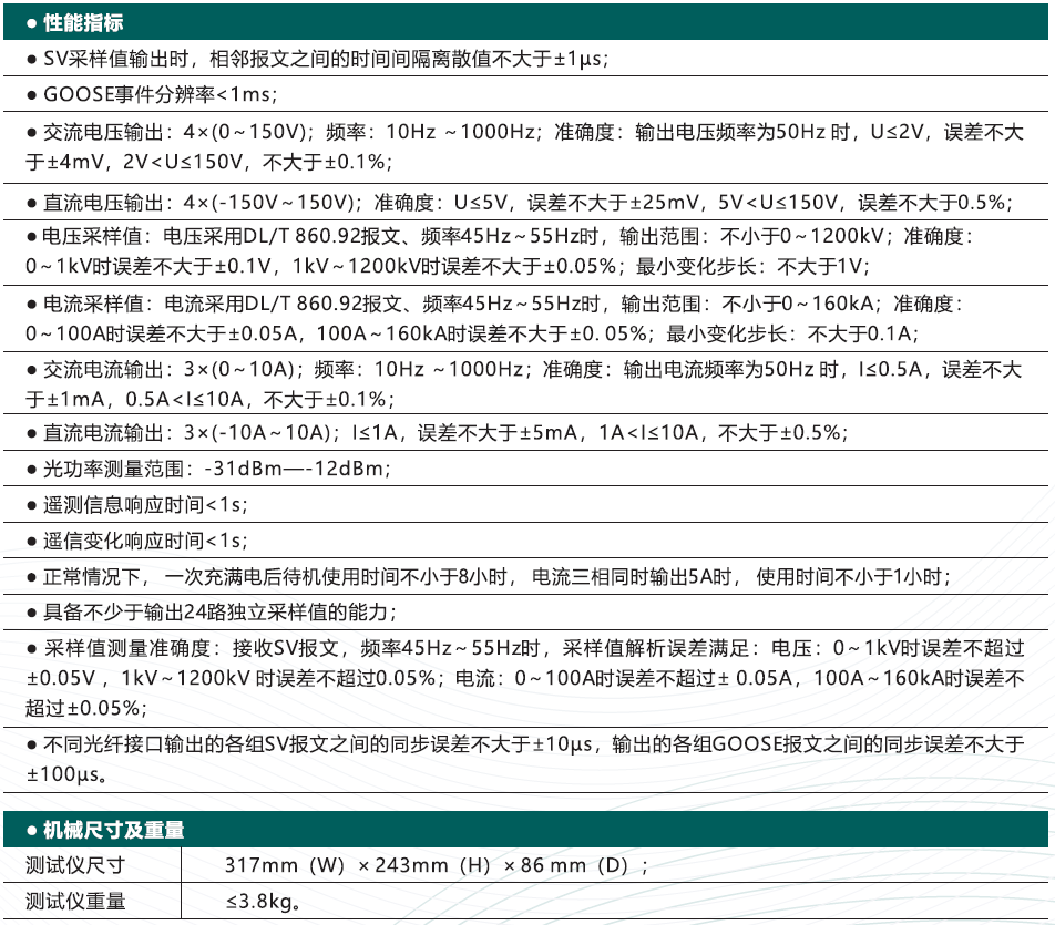 ■具有模擬量4路電壓、3路電流輸出接口,2路100M光以太網接口,1路100M/1000M復用光以太網接口,可滿足變電站現場及實驗室環境下光數字式繼電保護、數字模擬混合式繼電保護、模擬式繼電保護調試、定檢及保護特性測試的需求;