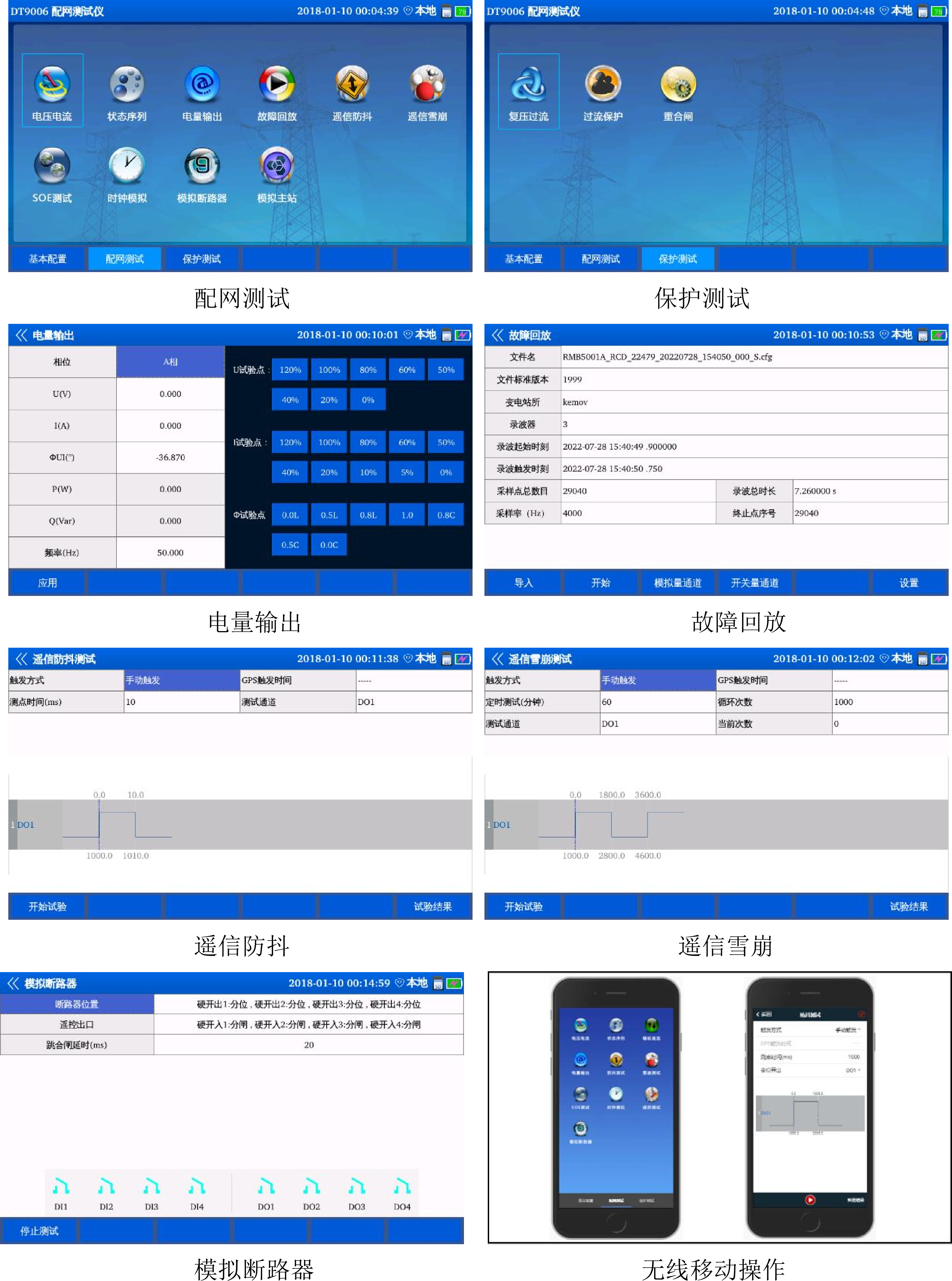 - DT9006配網(wǎng)測(cè)試儀采用異構(gòu)多核心架構(gòu)、觸控式交互、動(dòng)態(tài)功率控制等技術(shù),具備高采樣率的多路電壓、電流輸出和大容量續(xù)航能力。提供備用電池,支持模擬電壓電流功能、狀態(tài)序列測(cè)試、電量輸出、模擬斷路器、模擬主站、遙信防抖、遙信雪崩、遙信分辨率、故障回放和保護(hù)功能測(cè)試等,能夠?qū)︷伨€終端(FTU)、站所終端(DTU)和配變終端(TTU)進(jìn)行測(cè)試和故障檢修。支持無線連接移動(dòng)終端遠(yuǎn)方控制配網(wǎng)測(cè)試儀,操作人員通過手機(jī)遠(yuǎn)方控制便可完成配網(wǎng)測(cè)試和保護(hù)功能測(cè)試,針對(duì)塔、桿式設(shè)備的測(cè)試可以避免一定的攀爬作業(yè)。
